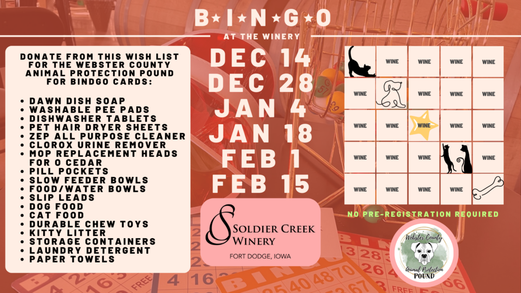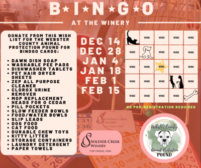 Bingo! Bring your friends, family, neighbors for a *good cause* and some fun! Select Sundays from 3-5PM. We are partnering with Webster County Animal Protection Pound, donate items off of their wish list or cash donation in exchange for bingo cards: