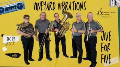 Holiday Brass Music Night returns to Soldier Creek Winery on Friday, December 19, from 6–8 PM, featuring the talented five-piece brass ensemble Jive for Five. This festive evening brings bold brass harmonies, cheerful classics, and joyful holiday music into a warm indoor setting perfect for the season. You’ll enjoy a cozy night filled with vibrant sound, great wine, and a relaxed atmosphere that feels like a true holiday treat.